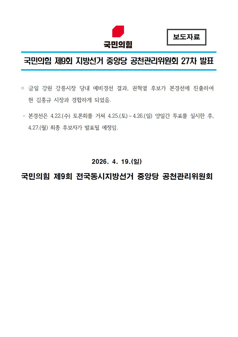| Á¦¸ñ | ±¹¹ÎÀÇÈû Á¦9ȸ Áö¹æ¼±°Å Áß¾Ó´ç °øÃµ°ü¸®À§¿øÈ¸ 27Â÷ ¹ßÇ¥ | ||||