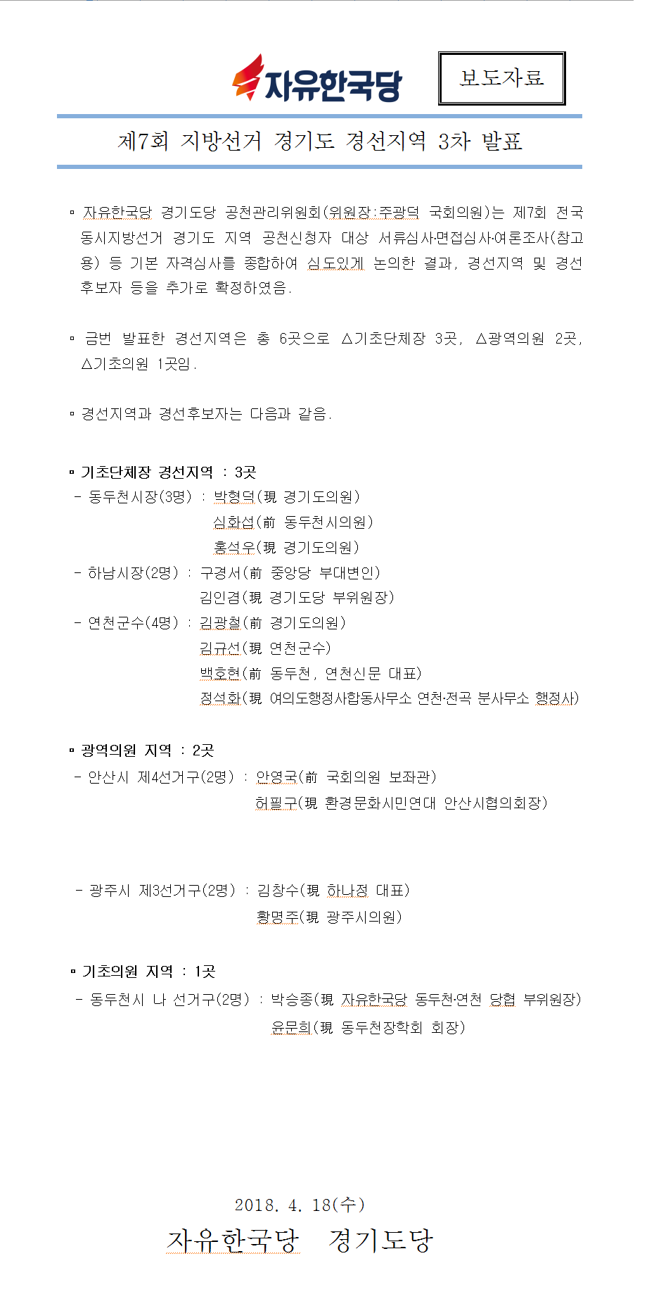 [ÀÚÀ¯Çѱ¹´ç °æ±âµµ´ç º¸µµÀÚ·á] 20180418_ Áö¹æ¼±°Å °æ¼±Áö¿ª 3Â÷ ¹ßÇ¥.hwp | ||||