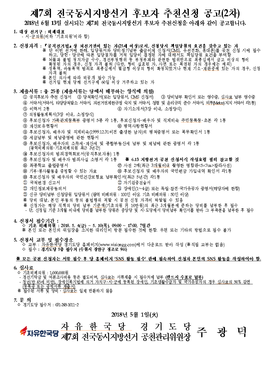 Á¦7ȸ Àü±¹µ¿½ÃÁö¹æ¼±°Å ºñ·Ê´ëÇ¥ Èĺ¸ÀÚ Ãßõ½Åû Ãß°¡ °ø°í(2Â÷) | ||||