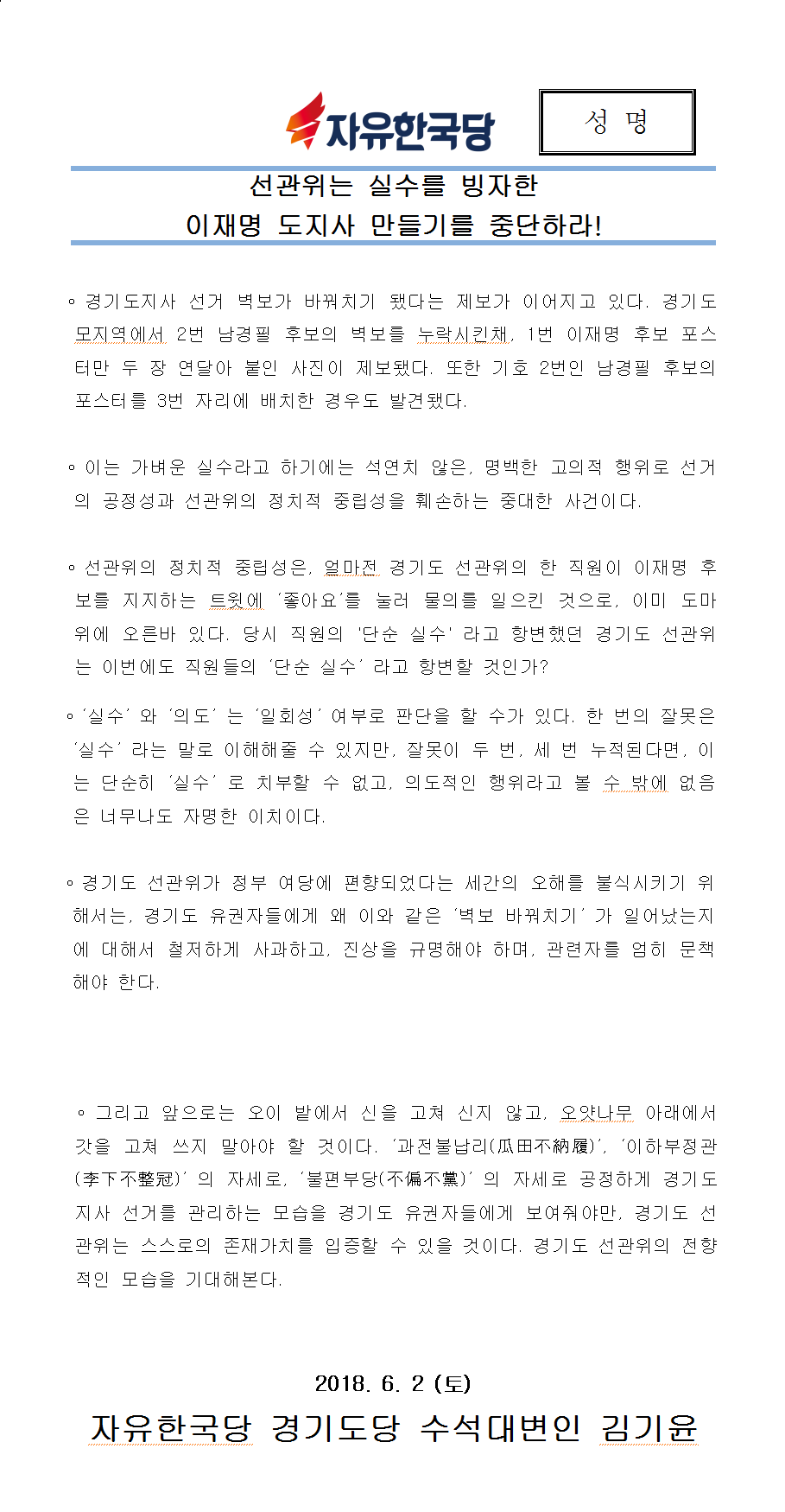 ¼±°üÀ§´Â ½Ç¼ö¸¦ ºùÀÚÇÑ ÀÌÀç¸í ¸¸µé±â¸¦ Áß´ÜÇ϶ó | ||||