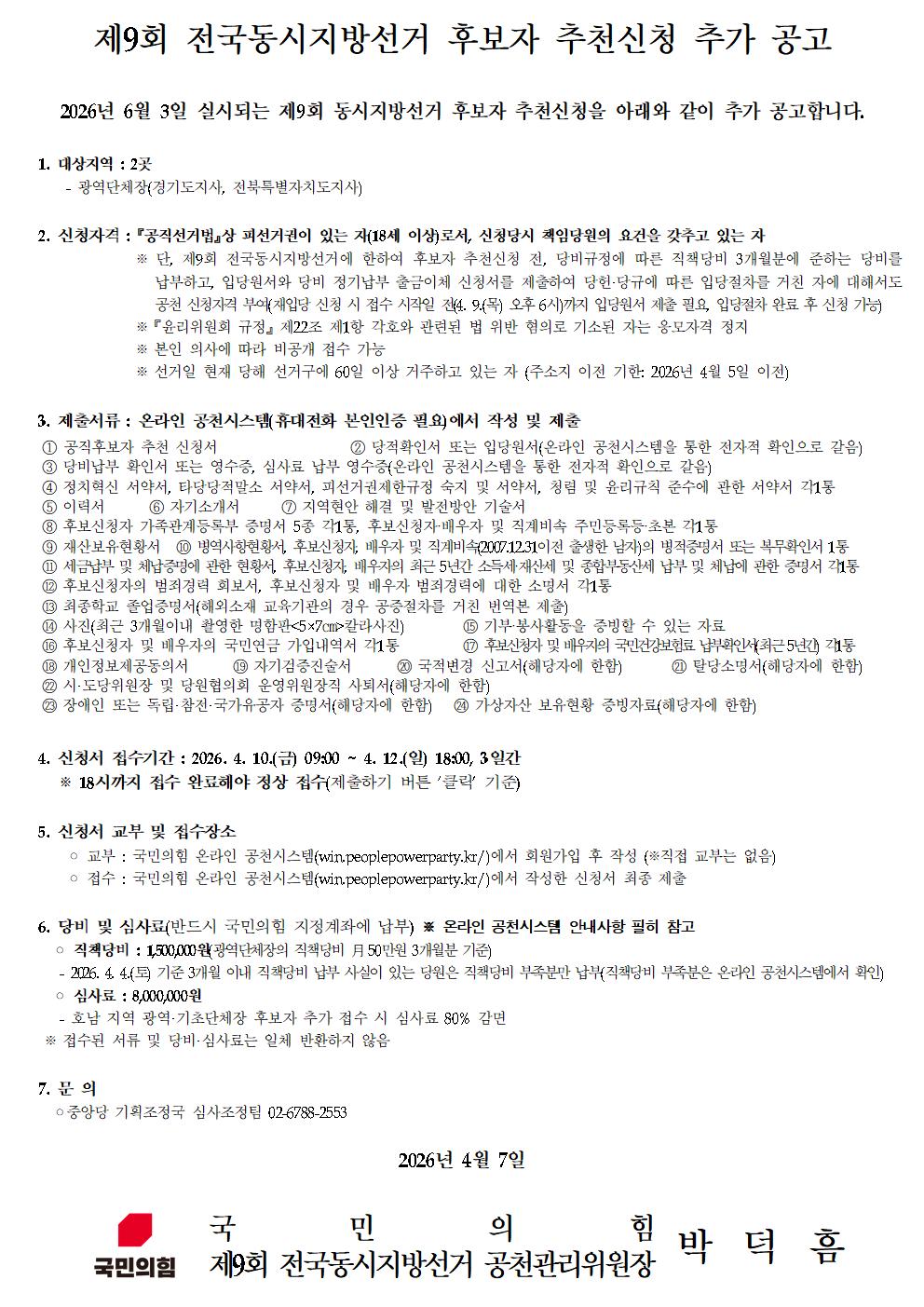Á¦9ȸ Àü±¹µ¿½ÃÁö¹æ¼±°Å Èĺ¸ÀÚ Ãßõ½Åû Ãß°¡ °ø°í | ||||