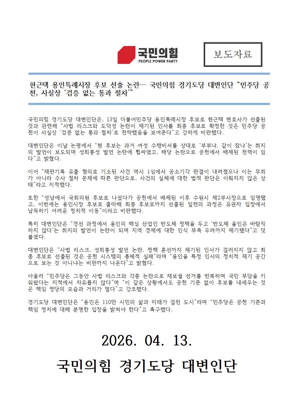 Çö±ÙÅà ¿ëÀÎÆ¯·Ê½ÃÀå Èĺ¸ ¼±Ãâ ³í¶õ¡¦ ±¹¹ÎÀÇÈû °æ±âµµ´ç ´ëº¯À뫆 ¡°¹ÎÁÖ´ç °øÃµ, »ç½Ç»ó ¡®°ËÁõ ¾ø´Â Åë°ú ÀýÂ÷¡¯¡± [º¸µµÀÚ·á] | ||||