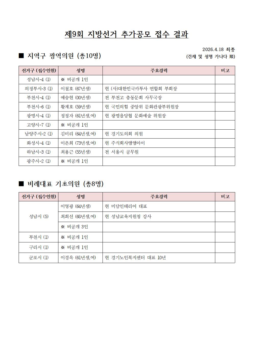 | ÀÌÀü±Û | Á¦9ȸ Àü±¹µ¿½ÃÁö¹æ¼±°Å Èĺ¸ÀÚ Ãßõ½Åû Ãß°¡ °ø°í | |