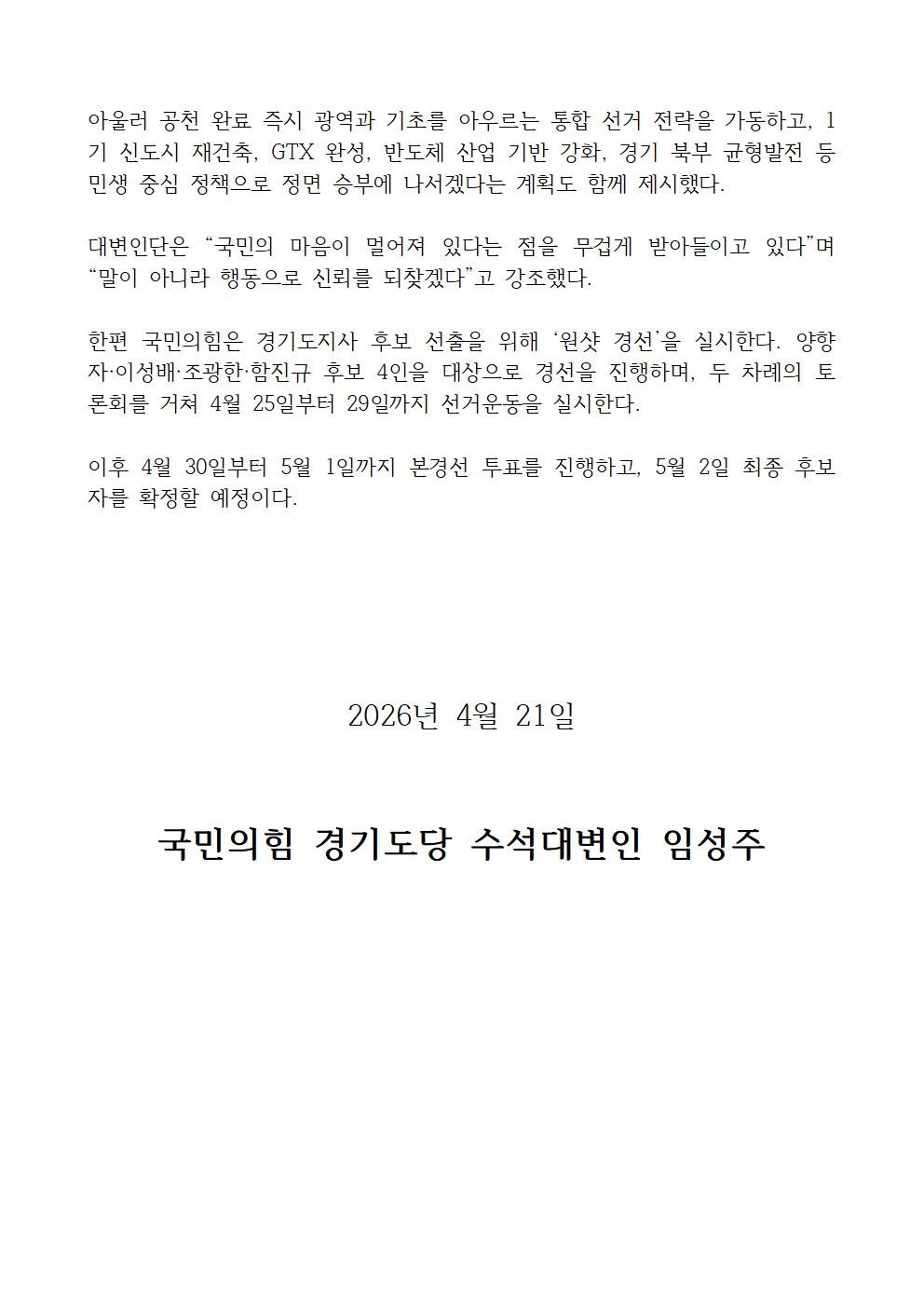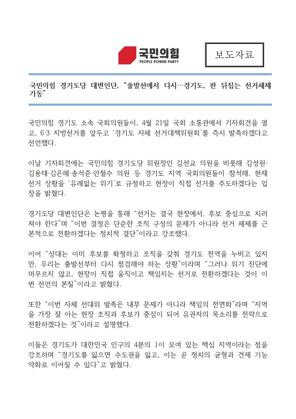 ±¹¹ÎÀÇÈû °æ±âµµ´ç ´ëº¯ÀδÜ, ¡°Ãâ¹ß¼±¿¡¼ ´Ù½Ã¡¦°æ±âµµ, ÆÇ µÚÁý´Â ¼±°ÅüÁ¦ °¡µ¿¡± [º¸µµÀÚ·á] | ||||